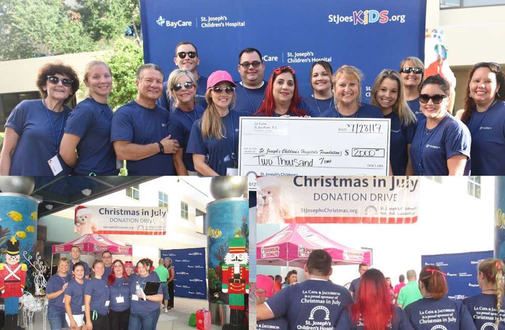 LA CAVA & JACOBSON, P.A. in Tampa recently participated in the St. Joseph’s Children’s Hospital Foundation’s annual “Christmas in July” Donation Drive. The donations of this amazing, heart-filled event help to provide recreation, developmental play and play therapy for very special children during their hospital stays. La Cava & Jacobson, P.A. is a proud sponsor of St. Joseph’s Children’s Hospital Foundation, and looks forward to continuing to do their part to bring “comfort and joy” to these remarkable children in our community.