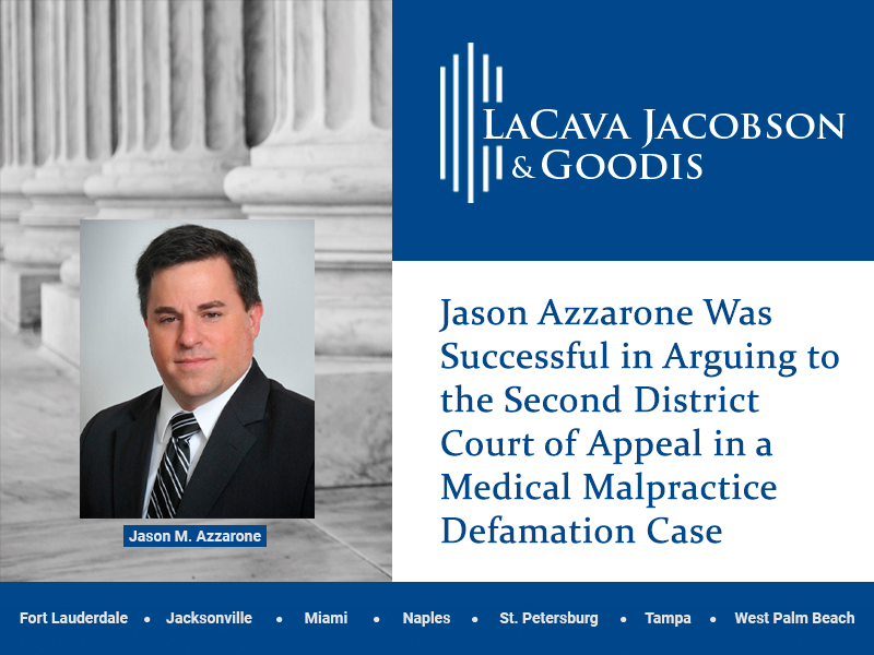 Jason Azzarone Was Successful in Arguing to the Second District Court of Appeal in a Medical Malpractice Defamation Case
