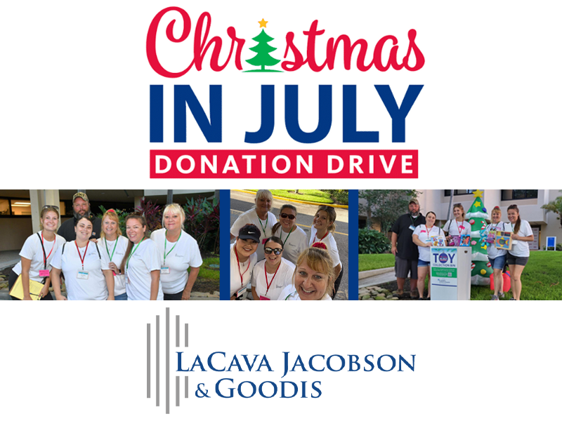 La Cava Jacobson & Goodis participated in the St. Joseph’s Children’s Hospital Foundation’s annual “Christmas in July” Donation Drive. This year the donation drive had a record-breaking year of over $215,000 raised through monetary and toy donations for St. Joseph’s Children’s Hospital and St. Joseph’s Hospital-South’s Child Life Specialist teams. Christmas in July is a month-long community-wide fundraiser to help raise funds for activities, experiences, and toys for St. Joe’s Kids.