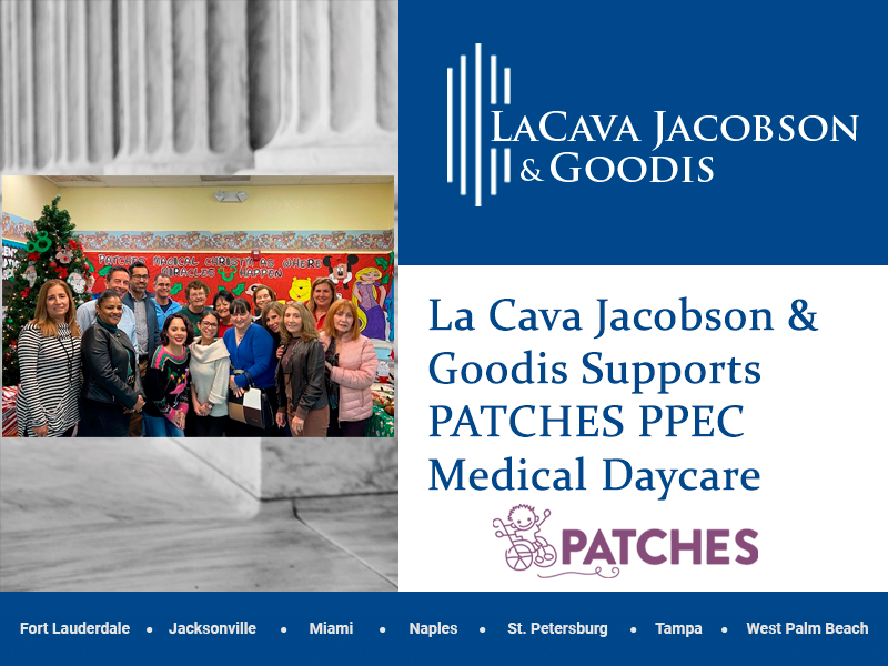 La Cava Jacobson & Goodis Miami office made a donation this holiday season to PATCHES PPEC. PATCHES PPEC takes care of medically complex children and their families. They have helped countless families manage their child’s health care needs so they can feel secure in returning to work or school. La Cava Jacobson & Goodis is pleased to partner and support the outstanding and compassionate care PATCHES provides to children with complex medical conditions in the Miami-Dade area.